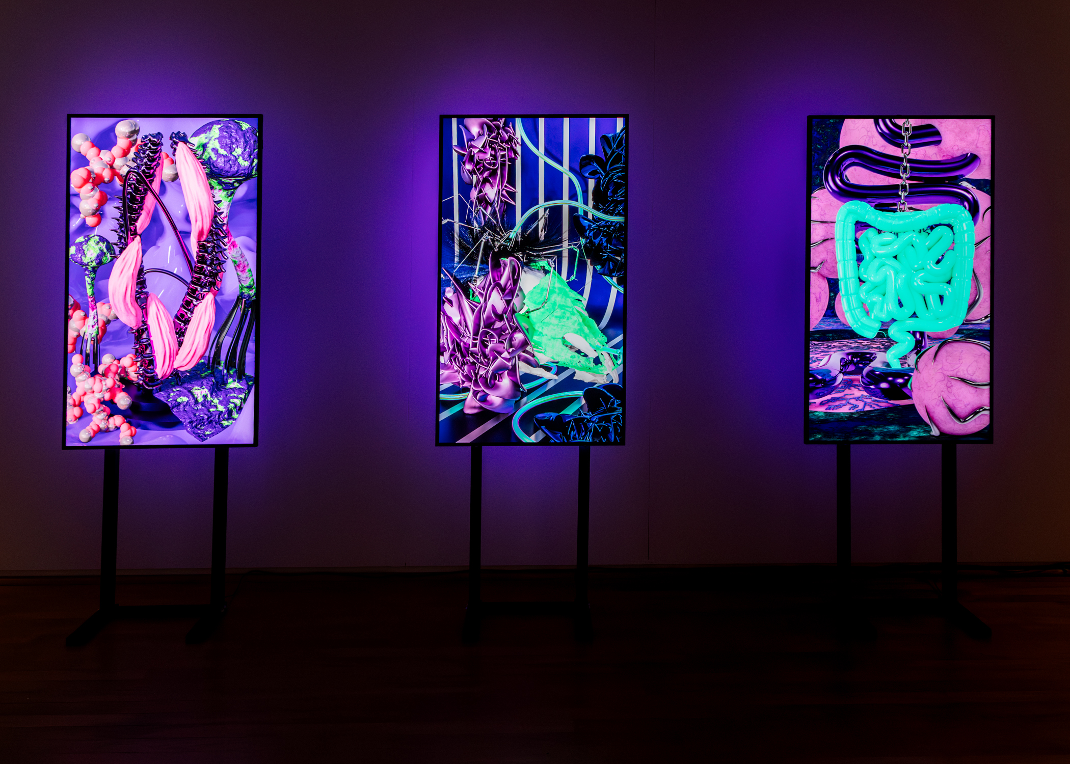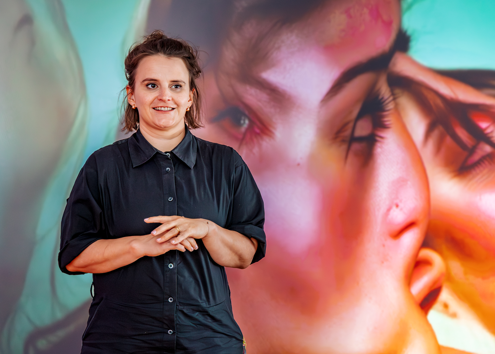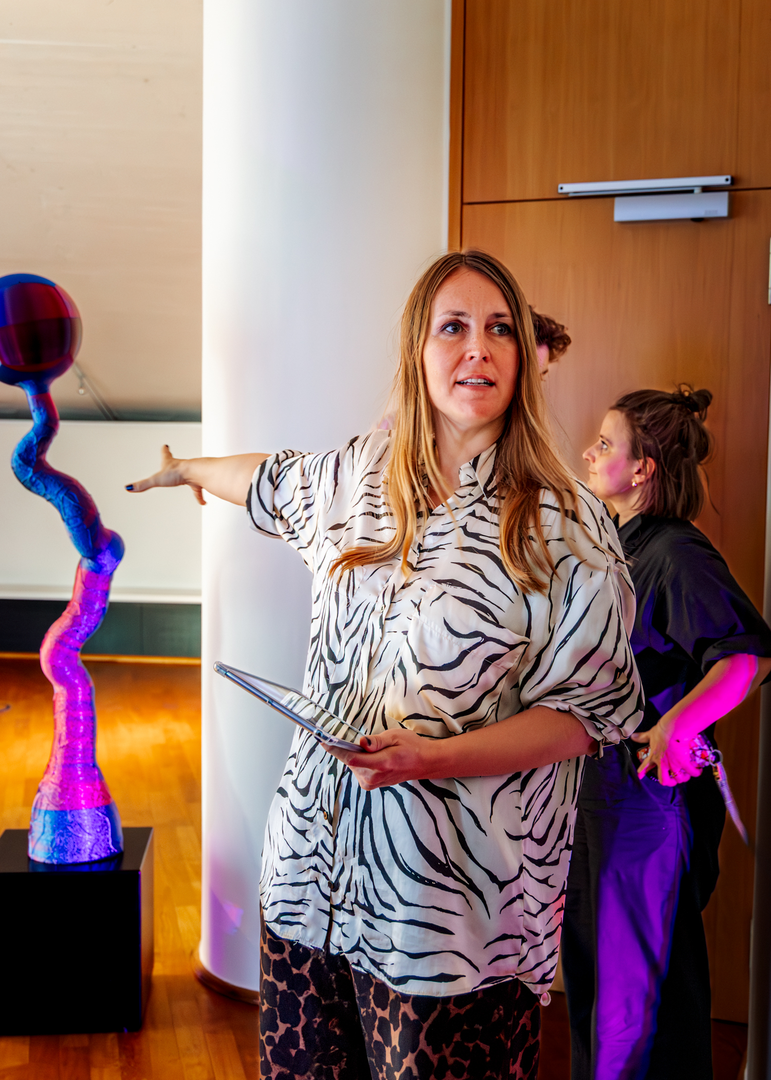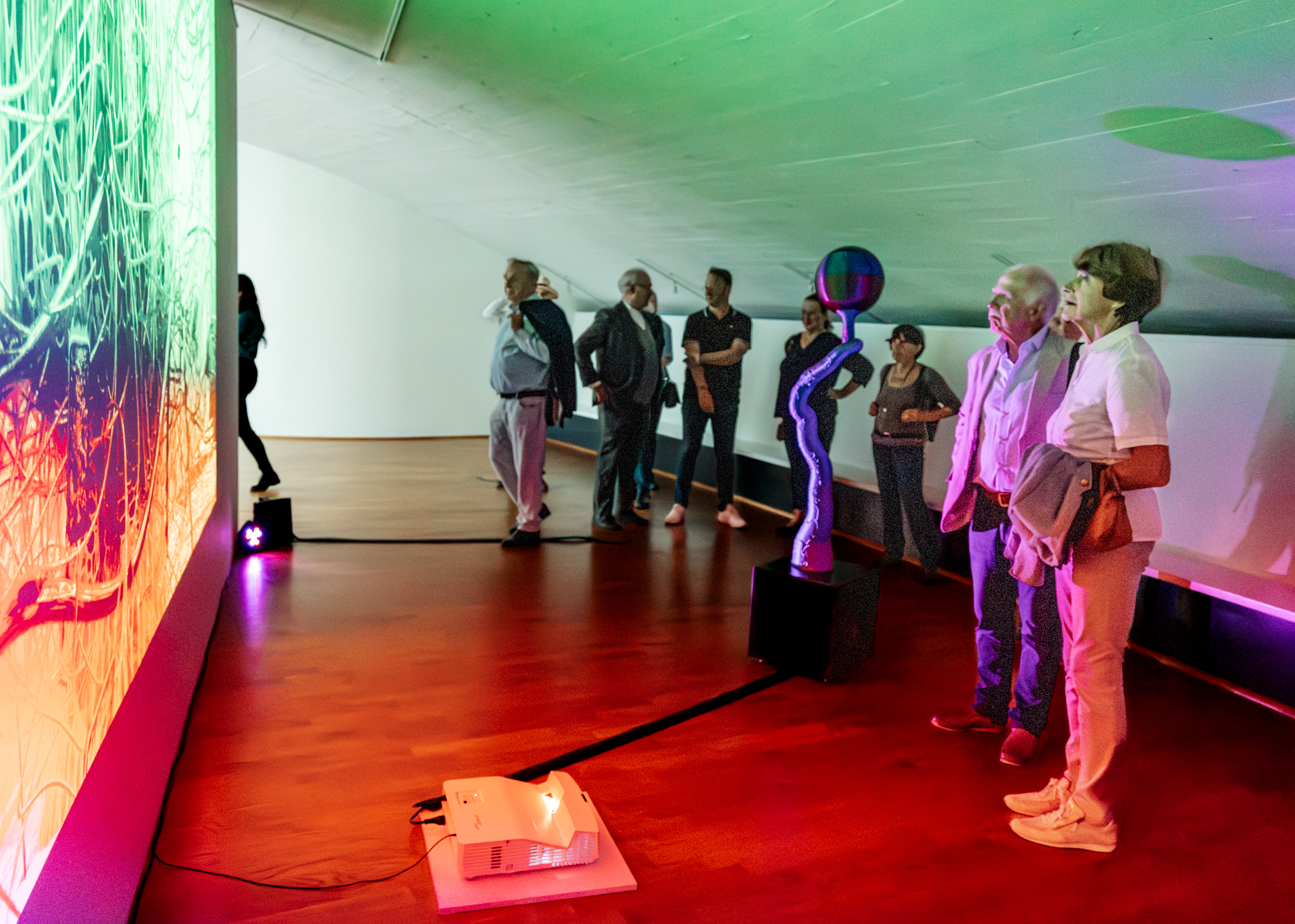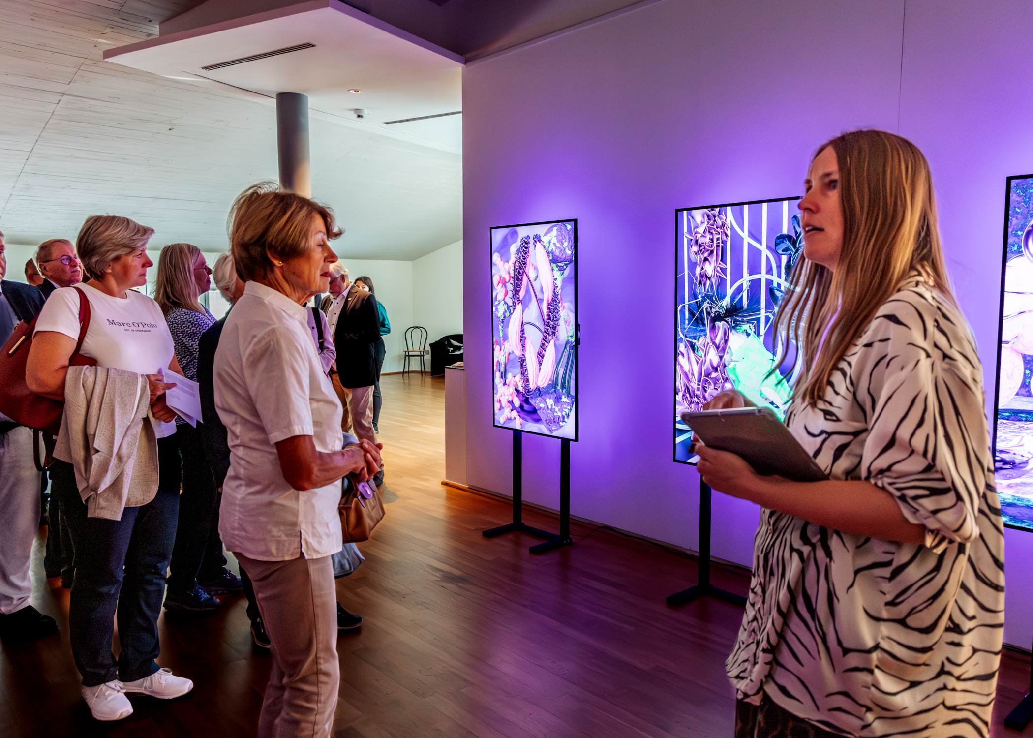 Passend zur „FeelAustriaWeek 2025“ durfte die Gruppe gleich zu Beginn eine brandneue Ausstellung erleben: „TECHNOSYMBIOSIS – Zwischen Code, Körper und System“. Kuratorin Peggy Schoenegge führte persönlich durch die Schau, begleitet von den beiden Künstlerinnen Dagmar Schürrer (Österreich) und Jess Tucker (USA/Niederlande).
