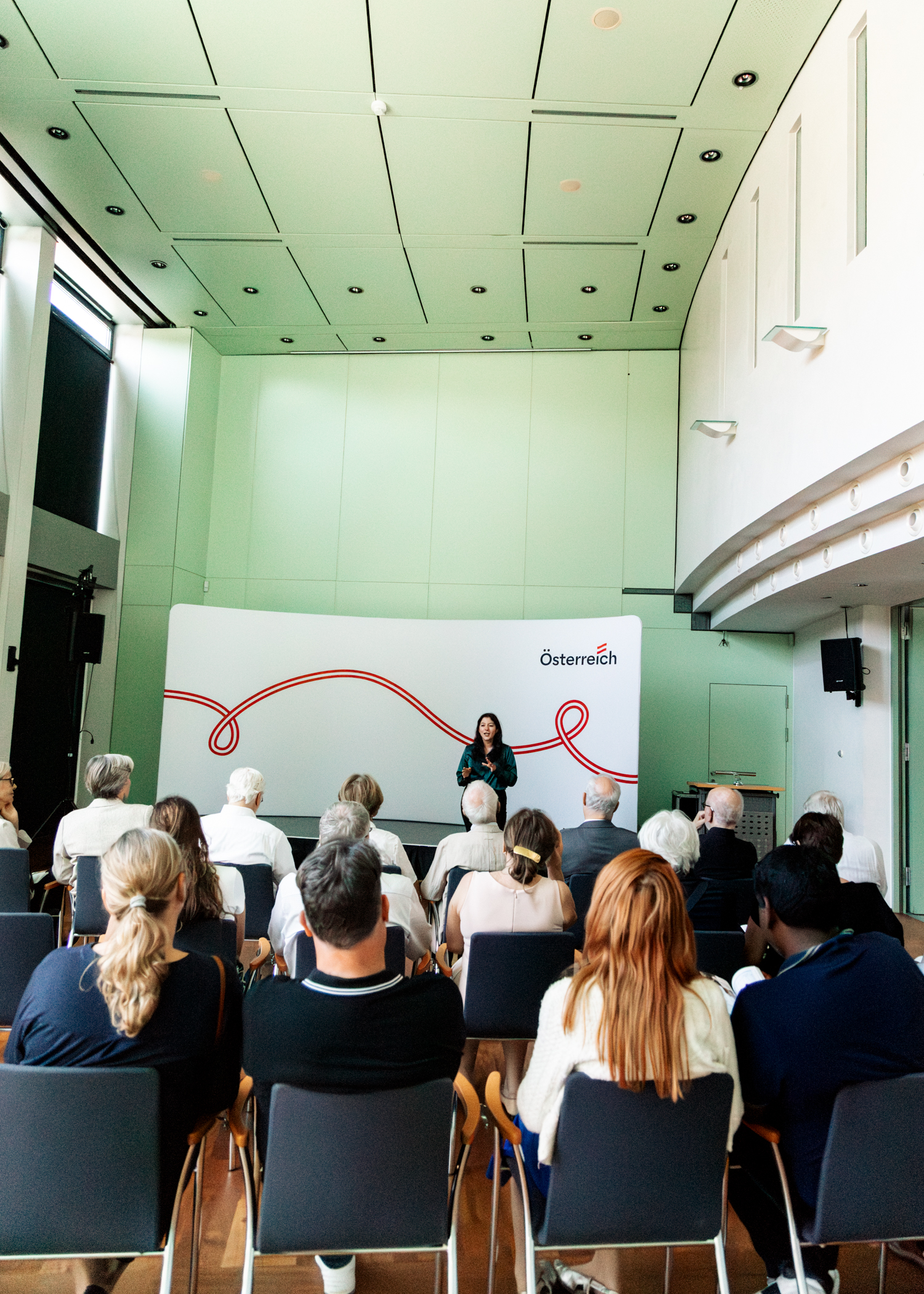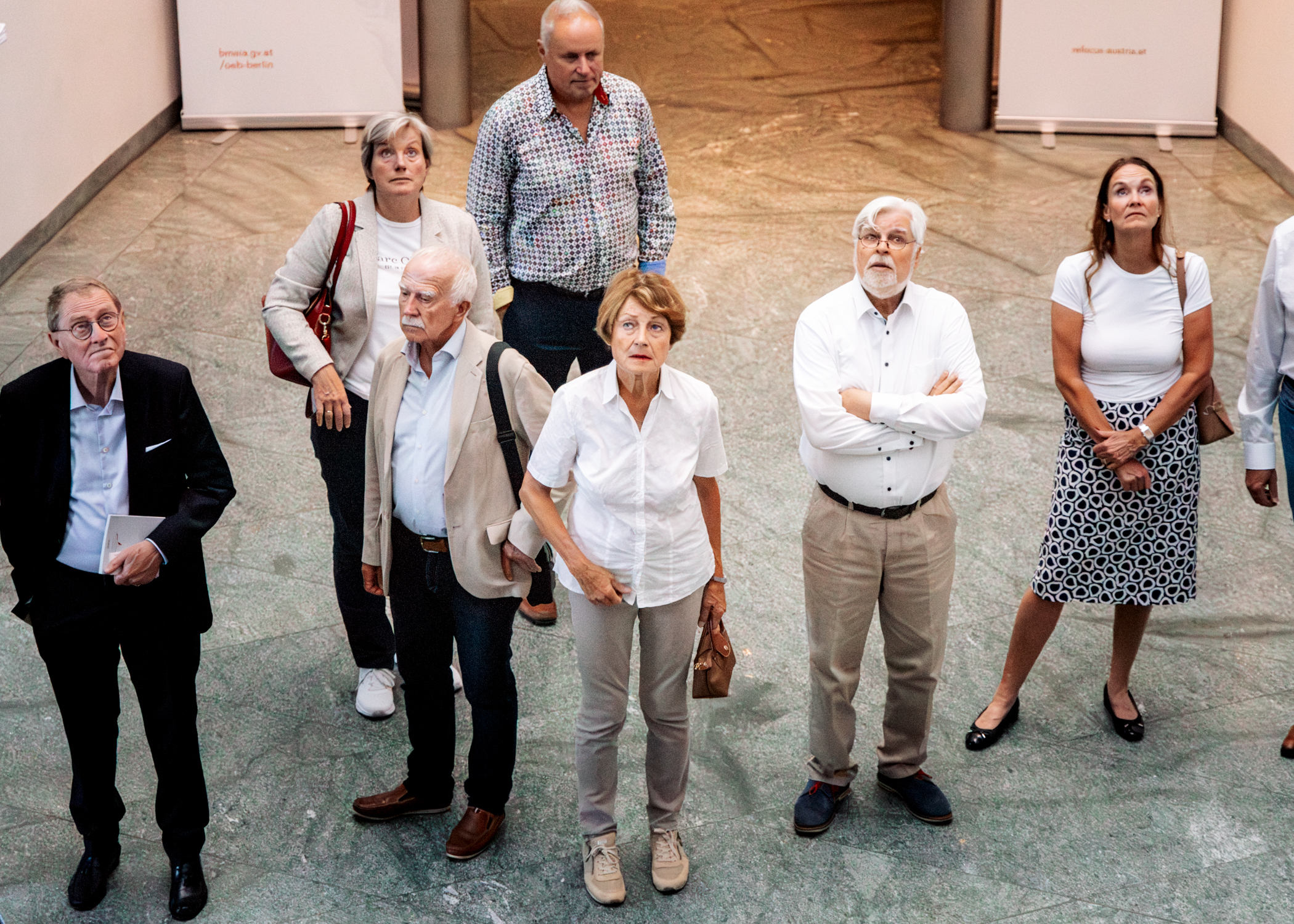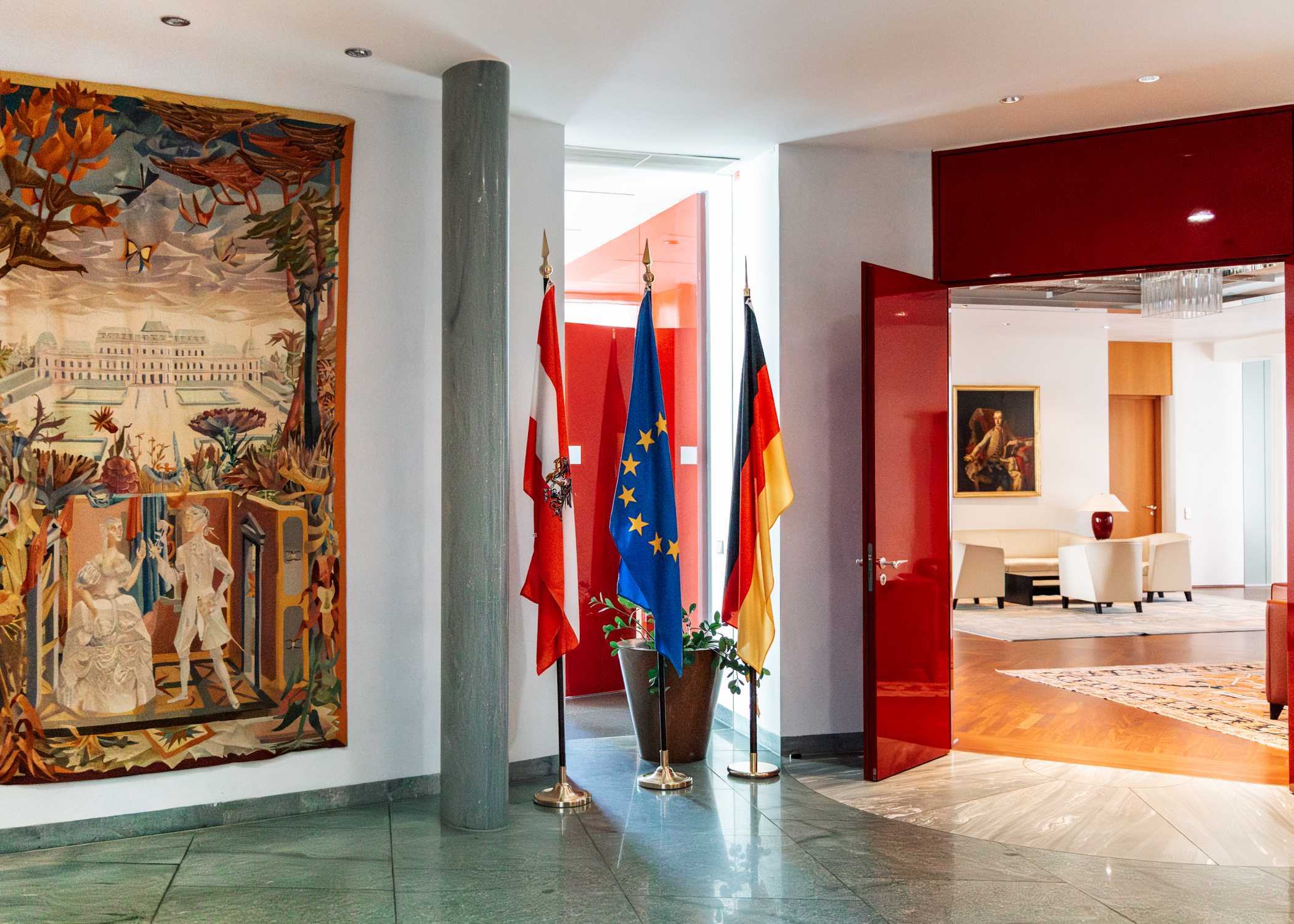Im Anschluss ging es in den Versammlungsraum der Botschaft. Dort nahm Vanessa Holer die Gruppe mit auf eine architektonische Zeitreise: vom Spatenstich bis zur Einweihung des heutigen Botschaftsgebäudes im Jahr 2001 durch Benita Ferrero-Waldner und Joschka Fischer. Der von Stararchitekt Hans Hollein entworfene Bau besteht aus drei klar unterscheidbaren, doch harmonisch verbundenen Gebäudeteilen – ein Konzept, das bei den Gästen auf großes Interesse stieß. Zahlreiche Nachfragen beantwortete Holer mit spürbarer Begeisterung.