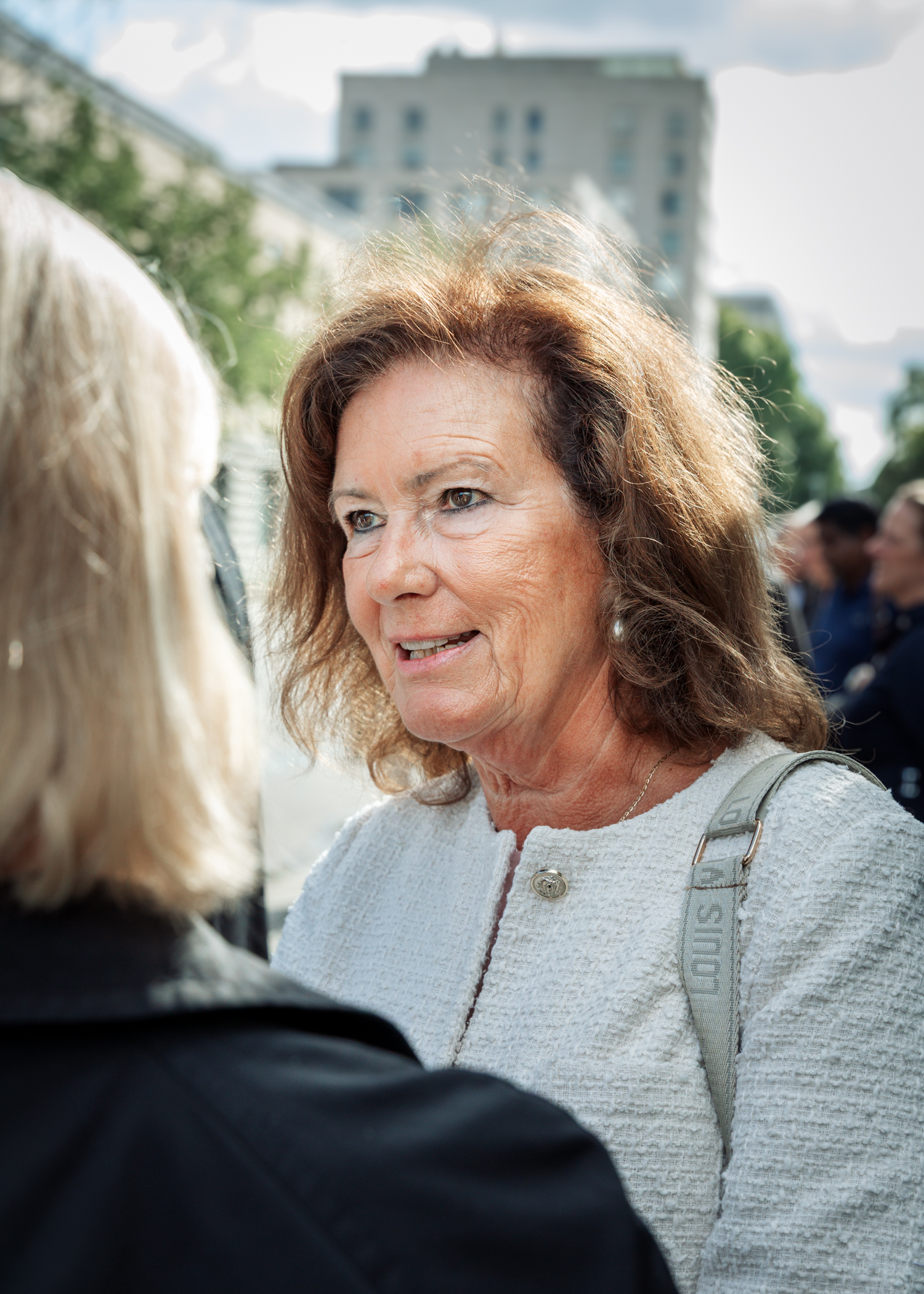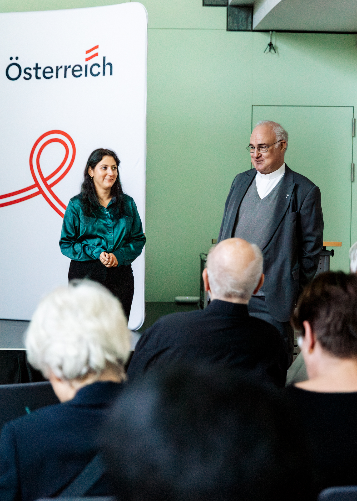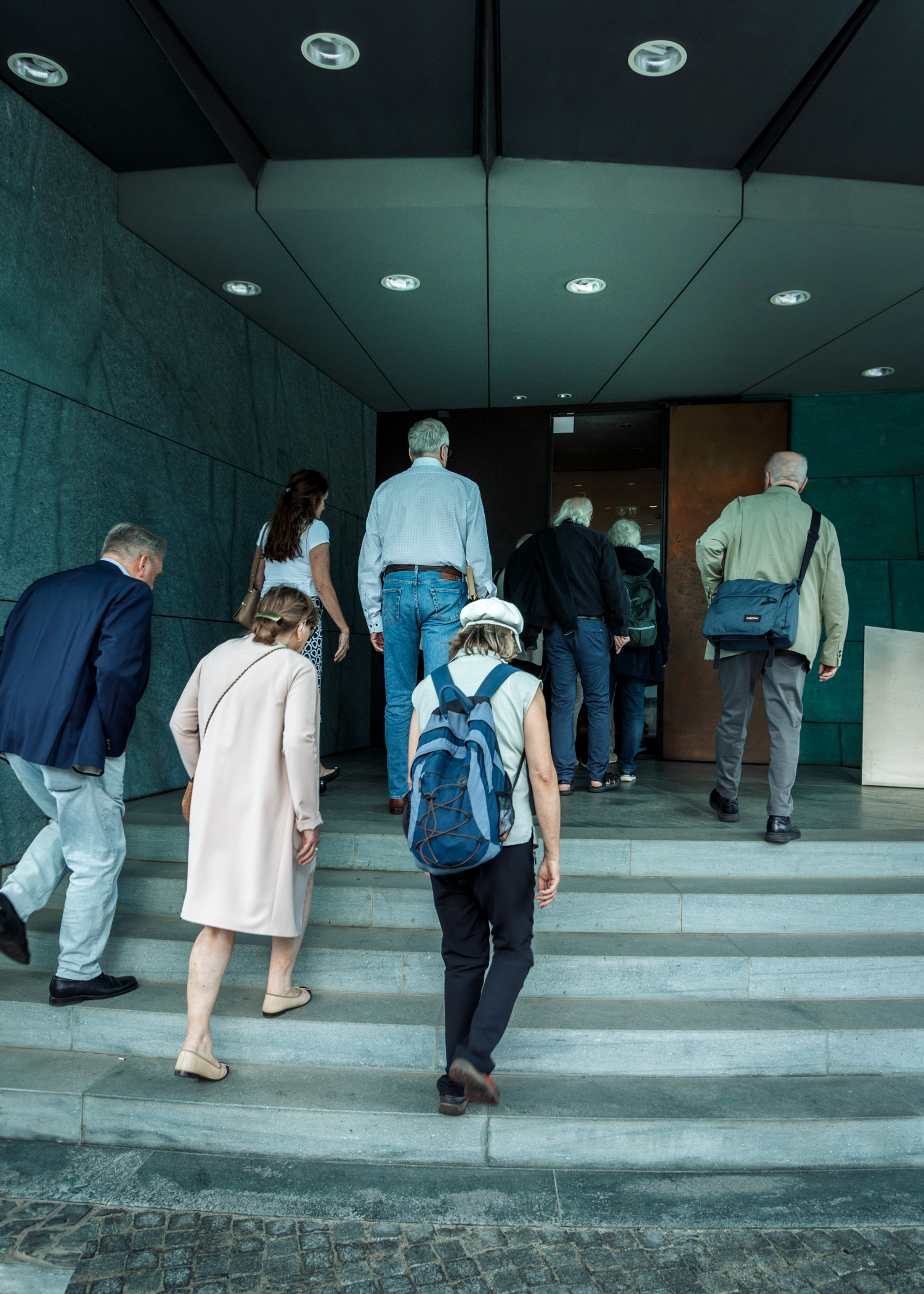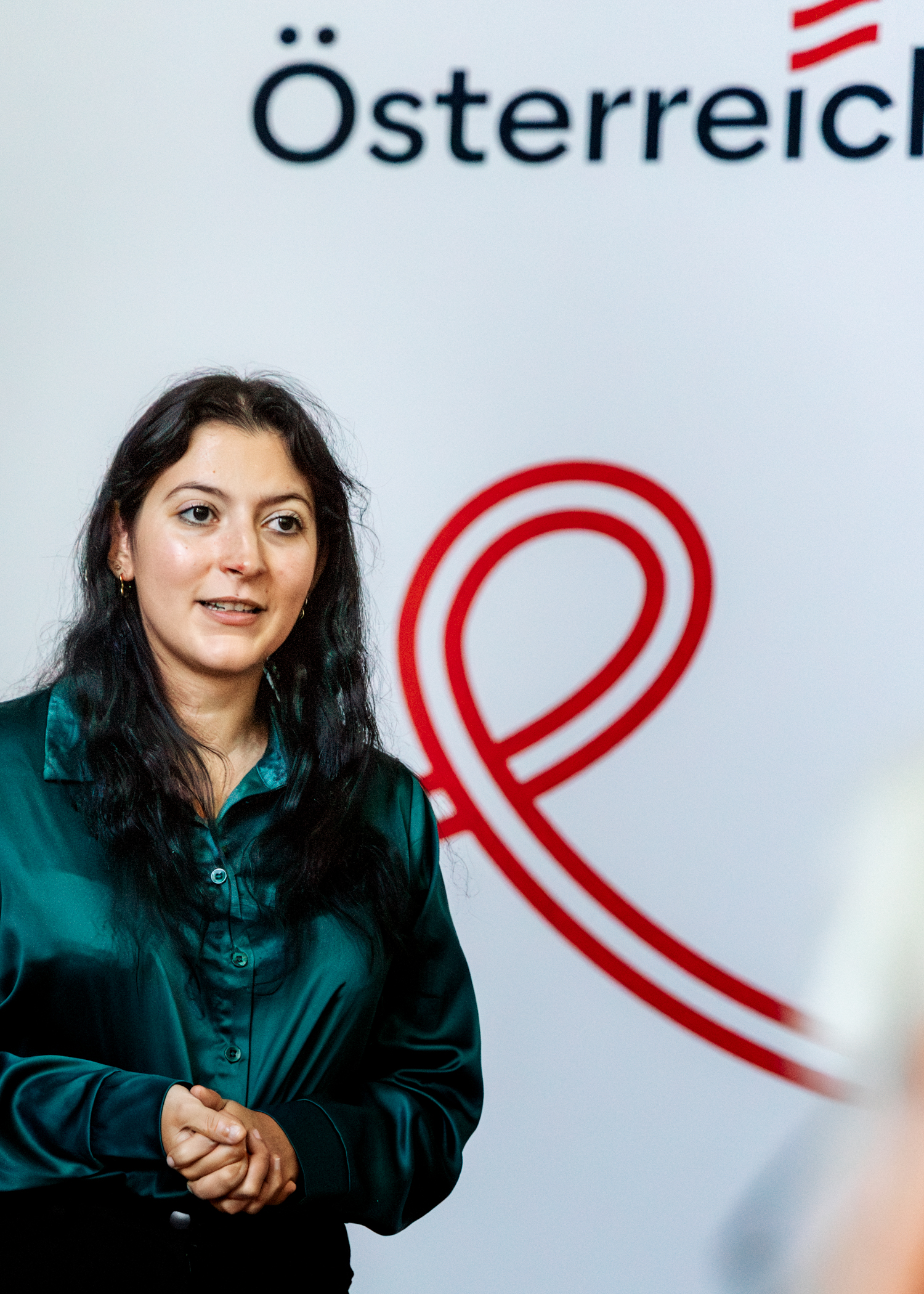 Im Anschluss ging es in den Versammlungsraum der Botschaft. Dort nahm Vanessa Holer die Gruppe mit auf eine architektonische Zeitreise: vom Spatenstich bis zur Einweihung des heutigen Botschaftsgebäudes im Jahr 2001 durch Benita Ferrero-Waldner und Joschka Fischer. Der von Stararchitekt Hans Hollein entworfene Bau besteht aus drei klar unterscheidbaren, doch harmonisch verbundenen Gebäudeteilen – ein Konzept, das bei den Gästen auf großes Interesse stieß. Zahlreiche Nachfragen beantwortete Holer mit spürbarer Begeisterung.