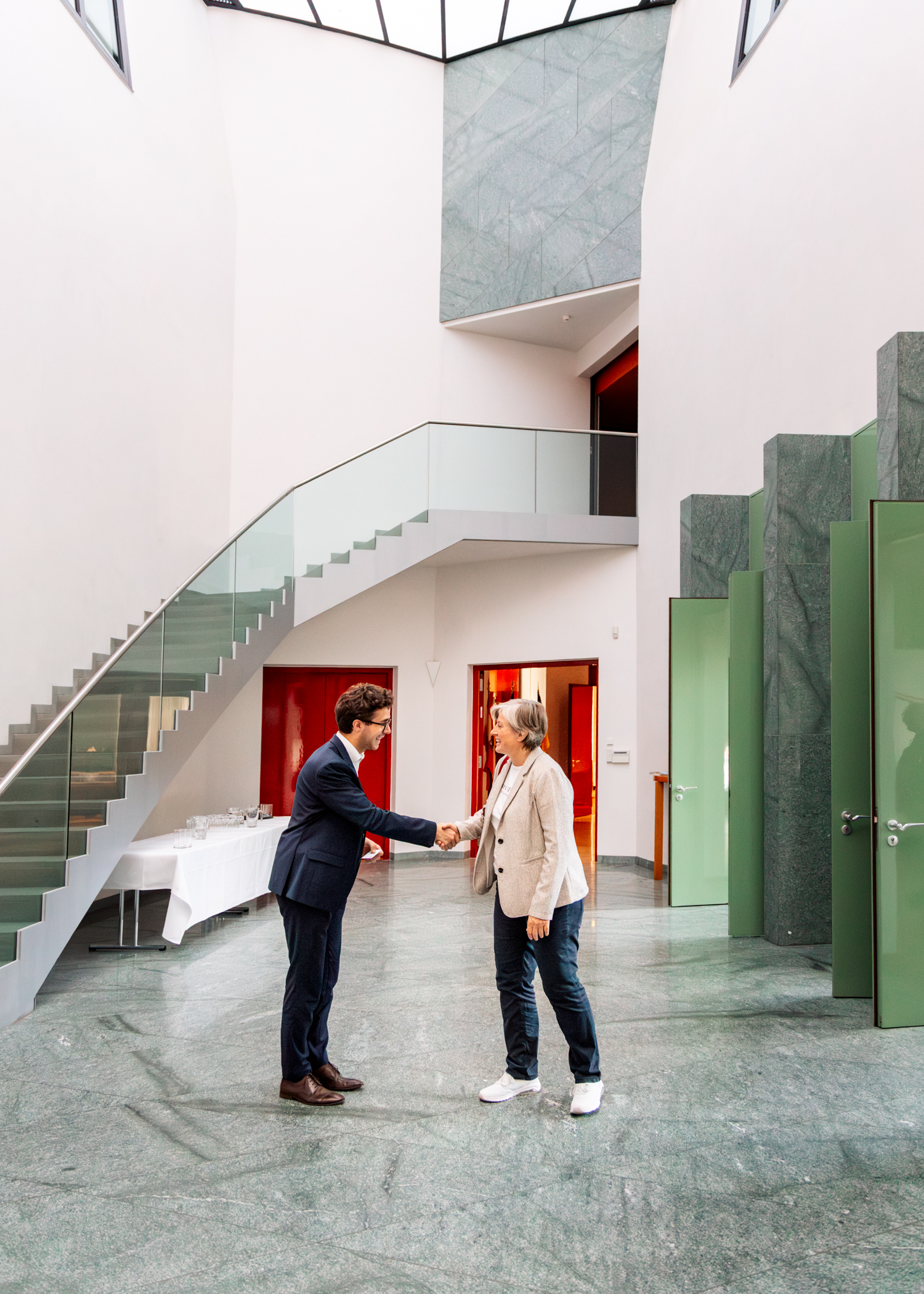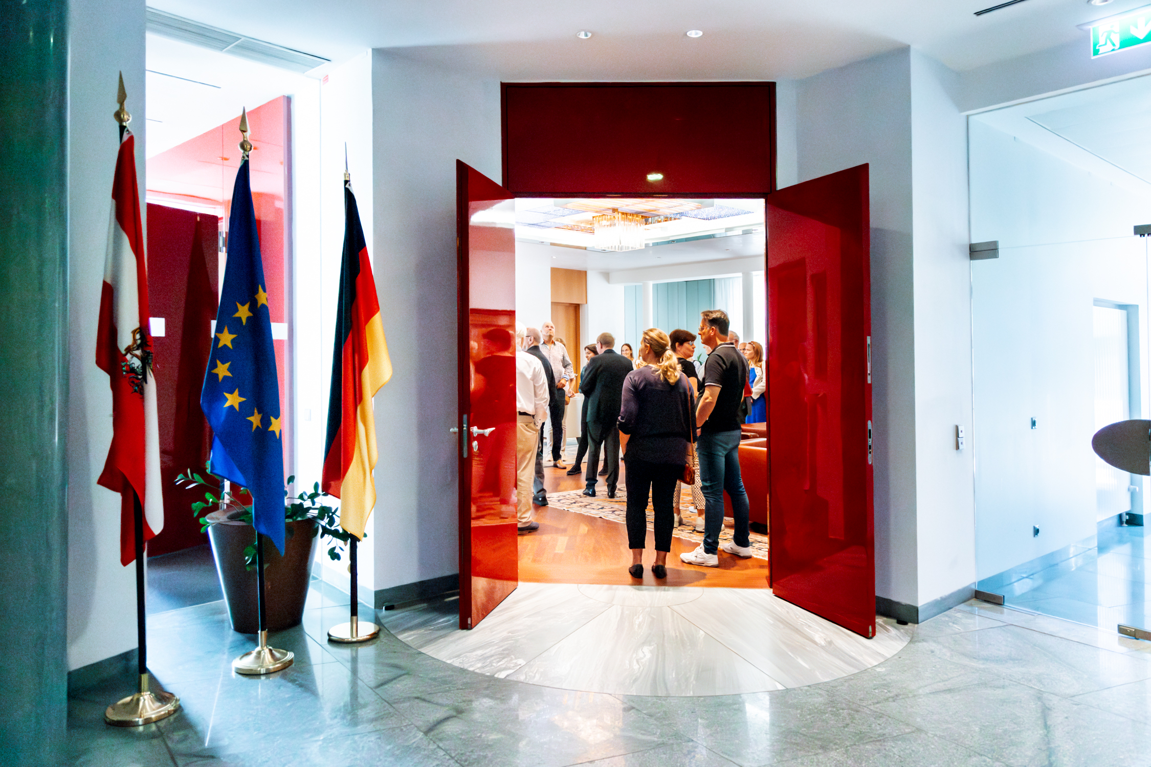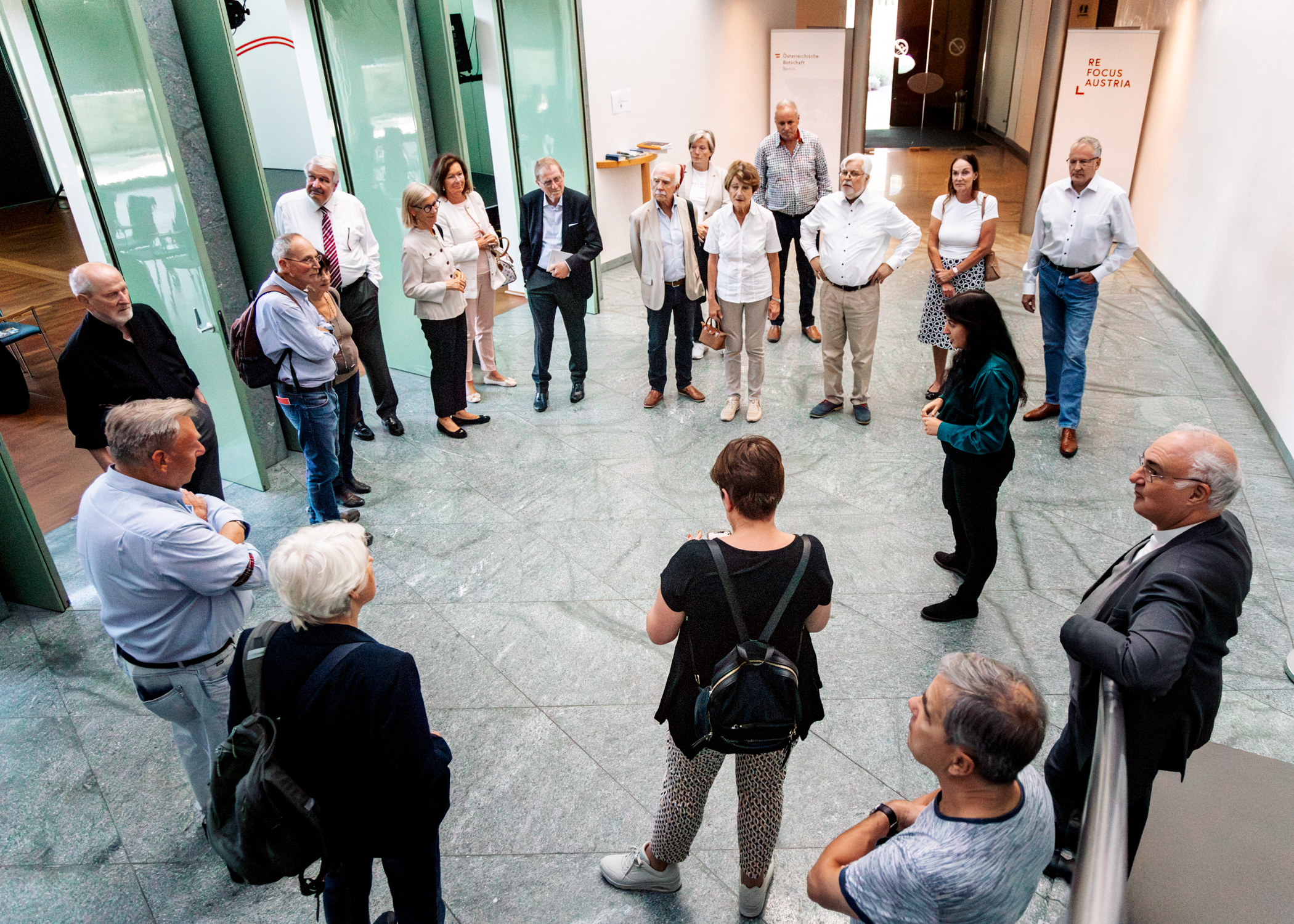 Die neue Westwind-Reihe „Besuche bei Botschaften“ zieht, über 30 Mitglieder folgten der Einladung, die österreichische Botschaft in der Stauffenbergstraße zu besuchen. Damit war fast ein Zehntel der gesamten Vereinsmitglieder vertreten, wie Bernhard Lütkemöller bei seiner Begrüßung stolz feststellte. Gemeinsam hieß er auch Johanna Rohland-Lindner, die Direktorin des Österreichischen Kulturforums Berlin, sowie Vanessa Holer aus dem Kommunikationsteam der Botschaft herzlich willkommen.